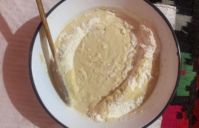 După ce aluatul a fost frământat, se acoperă vasul și se lasă la dospit aproximativ o oră și jumătate.