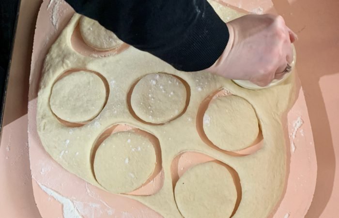 Apoi se taie aluatul în două și fără să fie modelat (asogat) se întinde cu sucitorul. Se presară cu făină. Se taie cu o formă rotundă, noi am folosit un capac.