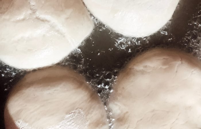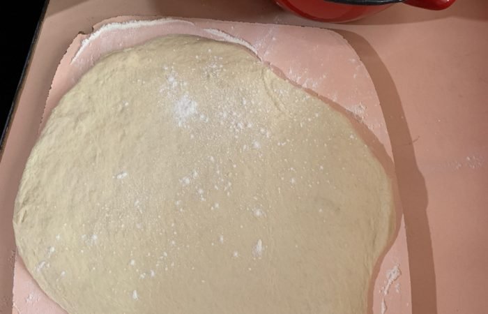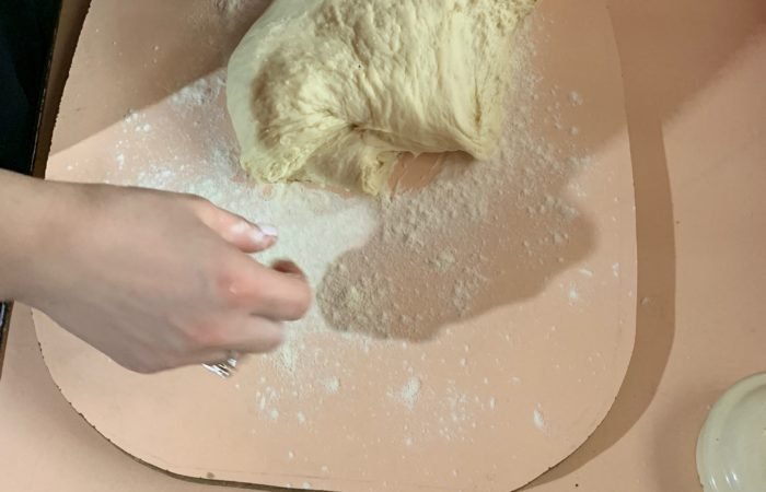 Apoi se taie aluatul în două și fără să fie modelat (asogat) se întinde cu sucitorul. Se presară cu făină. Se taie cu o formă rotundă, noi am folosit un capac.