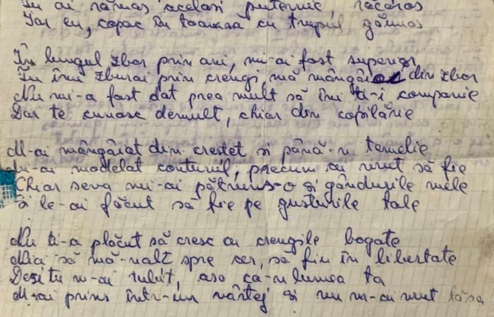 Las amintire aici, pentru anii ce vor veni, scrieri de demult, pe care le-am regăsit în lada cu caiete, compuneri, lucrări. Poezia îi aparține mamei mele.